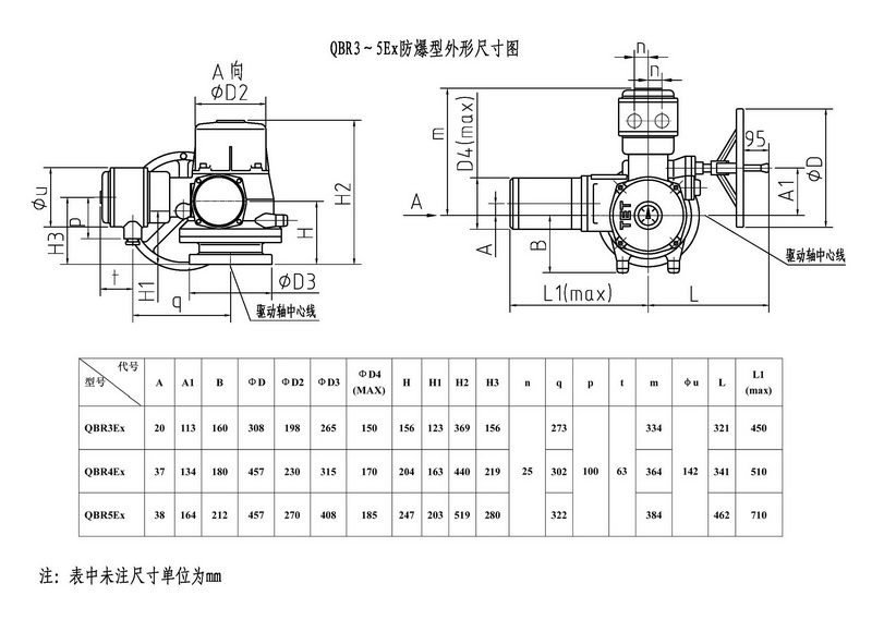 QBR3~QBR5是我公司研制的部分回轉閥門電動裝置,控制轉矩范圍:900N.m~12000N.m。該電動裝置可與球閥﹑蝶閥等閥瓣做90°回轉的閥門組合成電動閥門,其功能是控制閥門的啟閉。該電動裝置能夠進行單機或多機室內(nèi)控制遠距離控制電動操作和現(xiàn)場手動或電動操作,可廣泛地應用在具有管道閥門的工業(yè)系統(tǒng)。該產(chǎn)品的防護等級為IP67,隔爆型產(chǎn)品(型號中有Ex)的隔爆等級 為dⅡBT4。