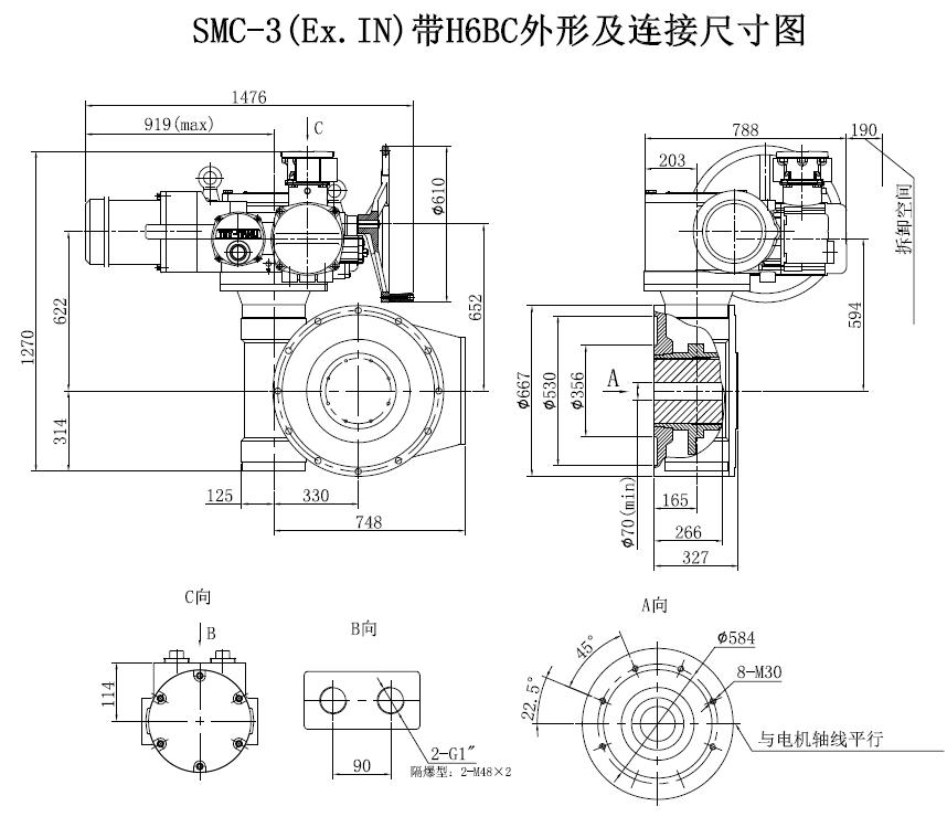 SMC/HBC系列電動裝置是SMC系列多回轉電動裝置與HBC蝸輪減速器的組合型式,它適合球閥、蝶閥等部分回轉閥門的驅動控制。SMC/HBC電動裝置具有以下特點:結構設計堅固可靠,產品規(guī)格齊全,驅動轉矩范圍大且動力輸出穩(wěn)定, 具有良好的自鎖性能。 HBC輸出軸結構獨特,裝有與閥桿連接的漸開線花鍵接頭,產品的安裝調試方便。